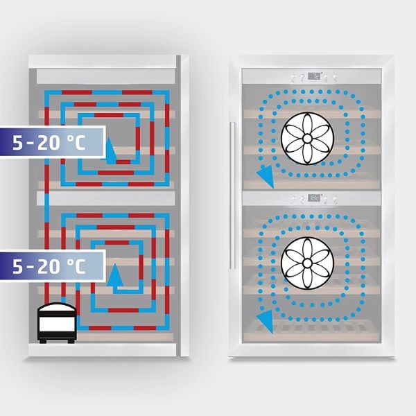 תצוגת LED מרהיבה של הטמפרטורה, חיישני מגע. טמפרטורה מתכווננת אלקטרונית, אזור טמפרטורה אחד – הניתן להתאמה עבור יינות אדומים או לבנים.
