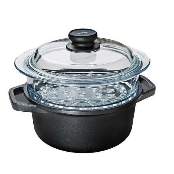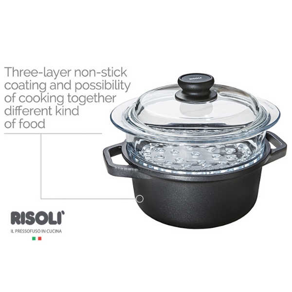 סיר Risoli VAPORPLUS AUTOGRAPH מיציקת אלומיניום עבה לפיזור חום מהיר יעיל ואחיד 20 ס"מ עם מכסה זכוכית. לבישול טבעי ובריא. מסדרת האקספלורה היוקרתית של ריזולי