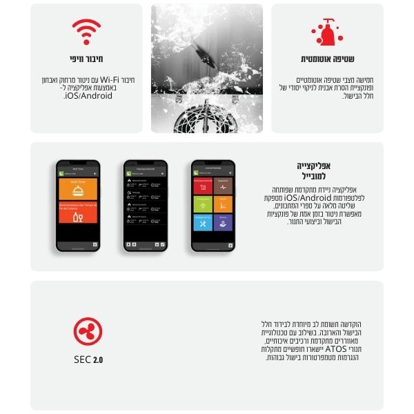מערכת שטיפה אוטומטית: מבטיחה ניקיון קל ומהיר לאחר כל שימוש. מסך מגע אינטליגנטי: מסך טאצ' צבעוני לשליטה נוחה ומתקדמת בכל פונקציות התנור. חיישן ליבה רב-נקודתי: לניטור טמפרטורת הליבה של המזון בצורה מדויקת. קישוריות Wifi ואפליקציה לנייד: שליטה בתנור מכל מקום ובכל זמן באמצעות אפליקציה ייעודית. אפשרויות בישול מרובות: כולל בישול, אידוי, שילוב קומבי, ושמירת חום.